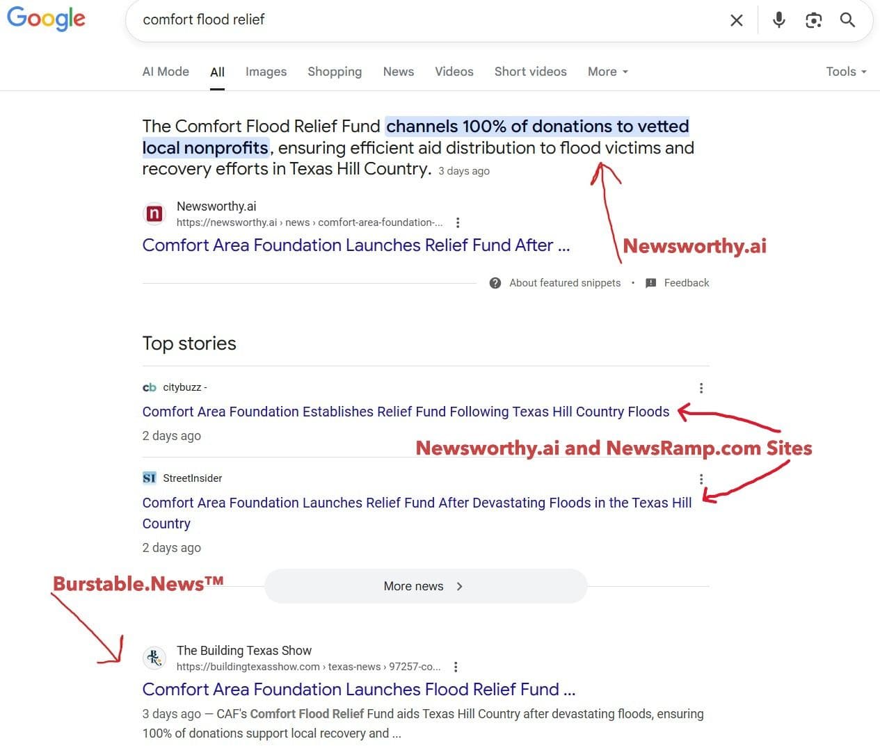 When devastating floods hit Comfort, Texas, the Comfort Area Foundation launched a flood relief fund but faced the challenge of gaining visibility for a brand-new donation site. By leveraging the combined power of Newsworthy.ai, NewsRamp.com, and Burstable.News™, the campaign quickly achieved top search rankings, AI snippet inclusion, and a surge in traffic—demonstrating how modern press release news marketing strategies can drive real-world impact.