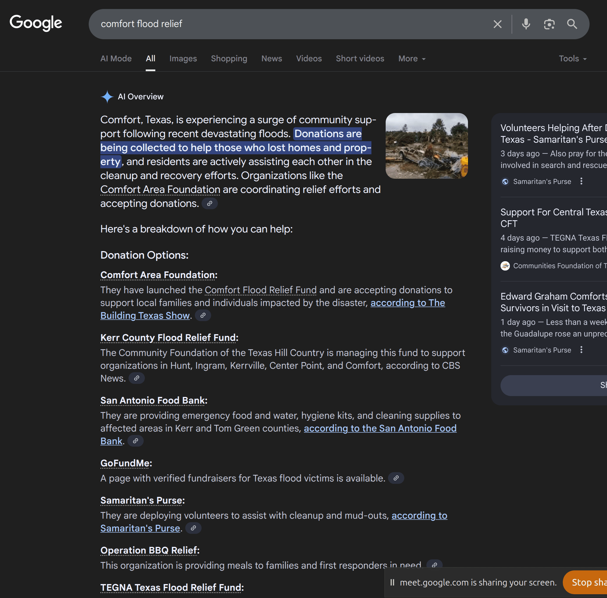 Additionally, the Google AI Overview (image below) pulled information directly from the Burstable.News™ content on the Building Texas Show website - and as a result, Comfort Area Foundation secured the #1 listing under Donation Options!